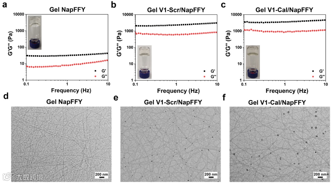如图2所示,流变力学和透射电子显微镜(TEM)结果表明,V1-Cal或其对照肽V1-Scr与NapFFY的共组装不影响形成的水凝胶的微观形貌,但明显提高了相关水凝胶的机械强度。