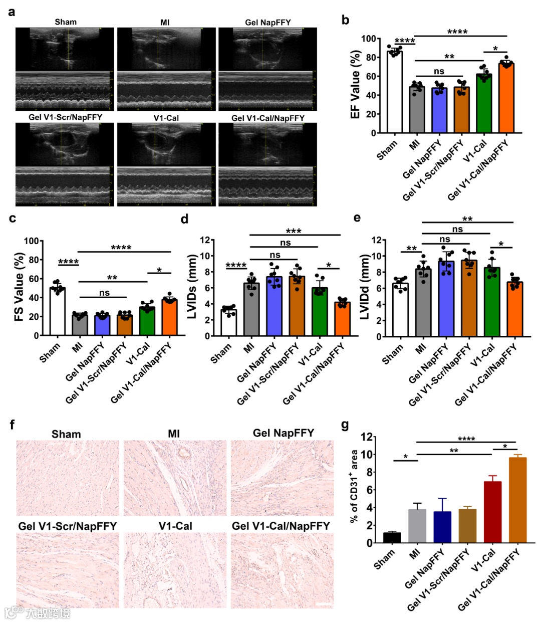 如图5所示,V1-Cal/NapFFY治疗后,心肌梗死大鼠心室功能障碍有明显改善。同时,V1-Cal可促进血管生成,这可能是V1-Cal改善心肌梗死后心功能的机制之一。整体而言,Gel V1-Cal/NapFFY对心肌梗死后大鼠心功能改善效果最好。