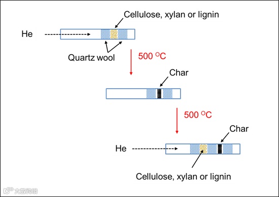 近日,蒙纳士大学张立安教授课题组在Chemical Engineering Journal (IF: 13.273) 上发表了题为“Elucidating the Synergistic Interaction and Reaction Pathway between the Individual lignocellulosic Components during Flash Pyrolysis”的论文。通过使用闪速热裂解仪(Pyroprobe)串联气相色谱对包括木质素、纤维素和半纤维素在内的生物质单个组分及其共混物,生物质组分的衍生物和其模型化合物进行了多角度测试。其中,为了研究衍生物(挥发物或焦)之间的相互作用,首先设计了如图1所示即A挥发物与B焦间的非均相反应的实验,在Pyroprobe 反应器中,首先将B组分单独放入反应器中,两侧各放置两层石英棉,在500 ℃下热解10 s得到其焦,待冷却至室温,将A组分置于B焦的左端,这样A组分经热解释放出的挥发物可在载气的夹带下通过B焦。而对于挥发物之间的相互作用,本文选择了纤维素的一种单体,即葡萄糖(C6H12O6), 并选取对甲酚(C7H8O)作为木质素挥发物中的芳烃代表,同样通过图1所示的反应管进行研究。