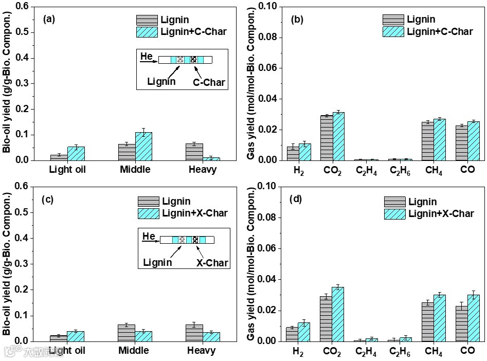 图3 在500℃下,纤维素或木聚糖挥发物经过/不经过木质素焦的生物油和气体组成
