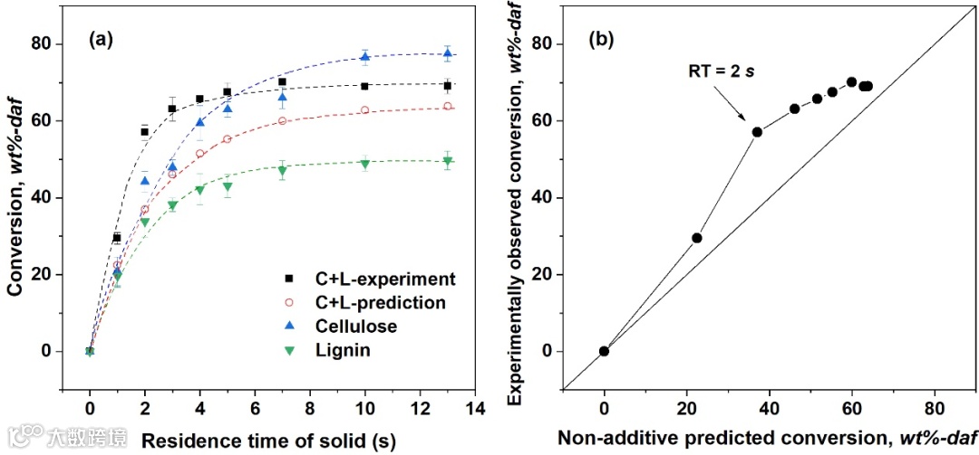 此外,木聚糖或纤维素与木质素之间的相互作用促进了整体转化更快地完成。在1或2 s的短时间内,自由基浓度最高,导致木聚糖或纤维素与木质素产生的挥发物之间的相互作用最强。