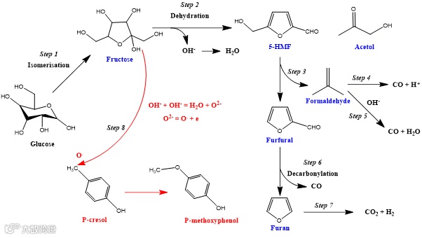 图2 葡萄糖和对甲酚在500 ℃共热解的反应路径