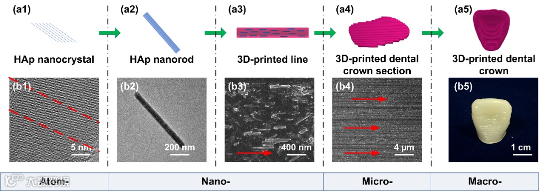 东华大学纤维材料改性国家重点实验室朱美芳院士、张耀鹏教授受到天然牙齿中牙釉质多阶段生长的启发,基于单分散的“超重力+”HAp基齿科修复树脂材料,采用挤出成型3D打印技术,开发了一种自下而上的逐步组装策略,利用剪切诱导构建了多尺度高度有序HAp结构的高精度仿生牙冠(图1),实现了天然牙的成分(HAp)、结构(紧密有序)以及性能(力学及再矿化)仿生。相关成果以题为3D Printed Strong Dental Crown with Multi-Scale Ordered Architecture, High-Precision, and Bioactivity发表在Advanced Science上,博士生赵梦露为第一作者,北京化工大学博士生杨丹蕾、范苏娜博士、姚响副教授和北京化工大学王洁欣教授为共同作者,张耀鹏教授和朱美芳院士为共同通讯作者。部分实验完成于上海光源BL19U2线站,北京化工大学合作制备“超重力+”羟基磷灰石。