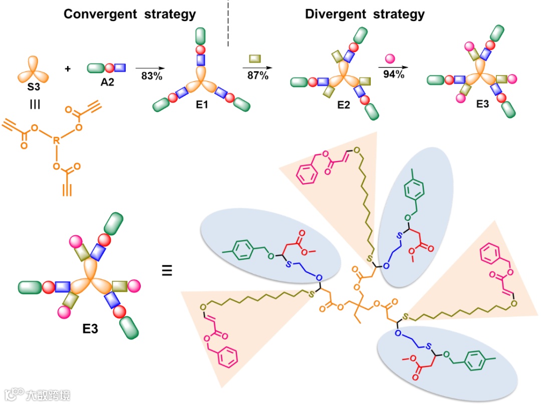 华南理工大学秦安军教授等长期致力于活化炔单体参与的新型点击聚合反应研究,近年来发展了多种基于活化炔单体的新型点击聚合反应(J. Am. Chem. Soc. 2017, 139, 5437−5443; Macromolecules2020, 53, 2516−2525; Macromolecules2019, 52, 4526−4533; Polym. Chem. 2020, 11, 2568–2575; Chem. Eur. J. 2017, 23, 10725−10731)。近期,他们首次创新性地将“羟基-炔”和“巯基-烯”点击反应结合,发展了一种新型迭代逐步合成策略,制备得到全新的序列精确寡聚(单硫代缩醛)。该合成策略相较之前工作,具有温和高效、无保护基团、无金属催化以及100%原子经济等诸多优点。