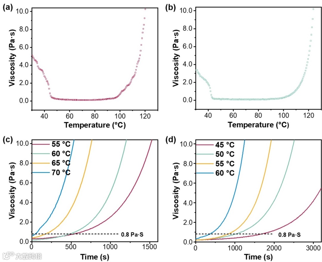 图5 AEp-1-IPDA和AEp-2-IPDA固化体系的粘度行为。(a) AEp-1-IPDA体系和(b) AEp-2-IPDA体系在升温速率为5°C min-1时的粘温曲线;(c)AEp-1-IPDA体系(55、60、65、70°c)和(d) AEp-2-IPDA体系(45、50、55、60°c)在恒定温度下的粘度-时间曲线
