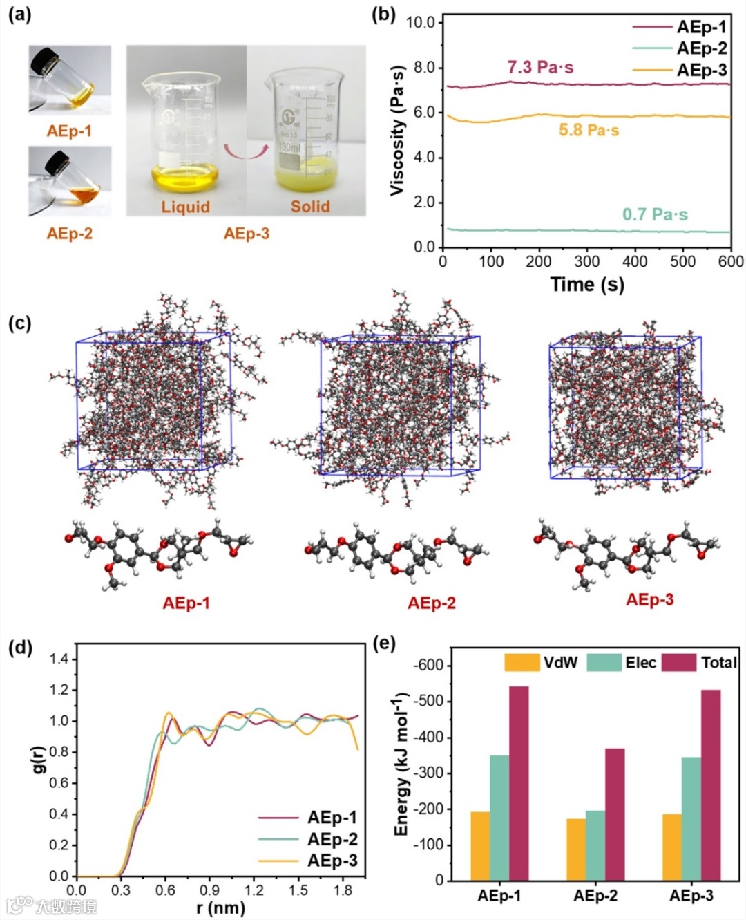 图4 三种环氧单体的粘度行为。(a)三种环氧单体的形貌(AEp-1和AEp-2在室温下为粘性液体,Aep-3最初为粘性液体,随着时间的推移逐渐结晶);(b)三种环氧单体在30 ℃下的粘度;(c)优化后的模拟盒子,分别由120个AEp-1分子、120个AEp-2分子和120个AEp-3分子组成;(d)三种环氧单体的径向分布函数;(e)三种环氧单体的平均分子间相互作用能