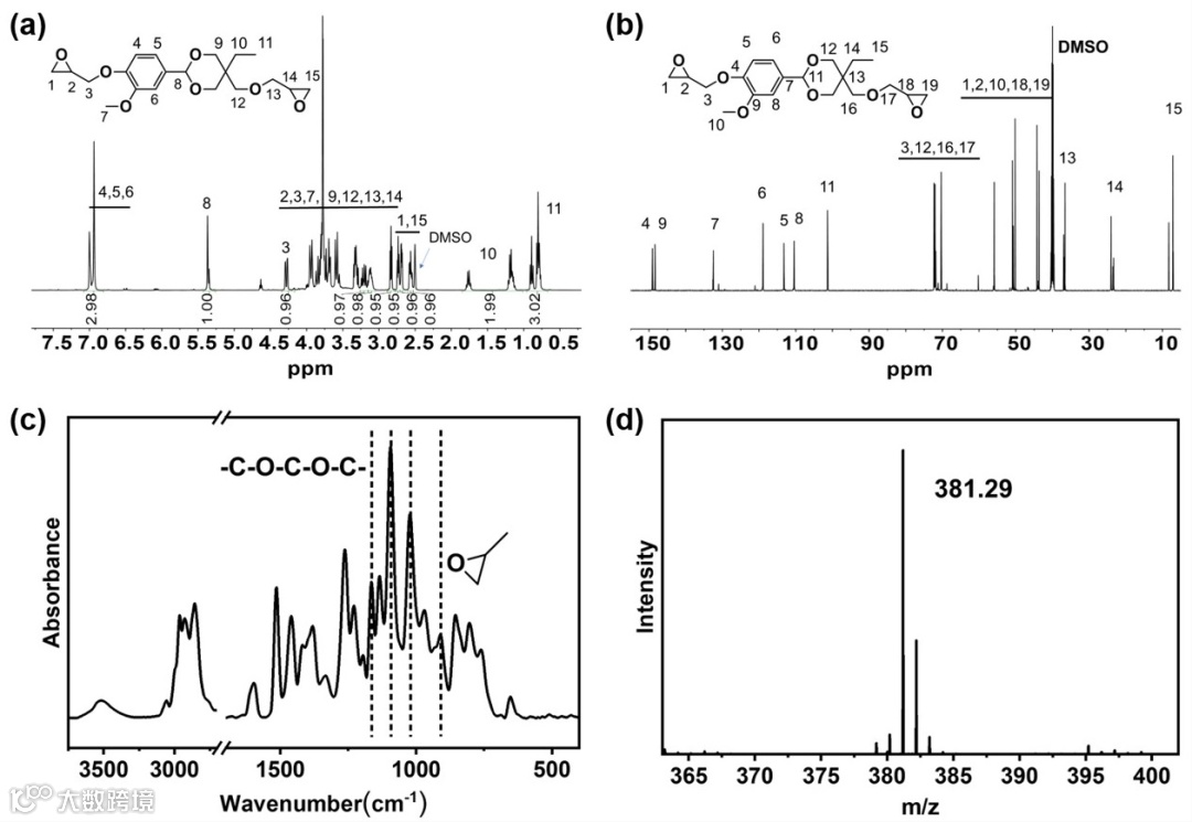 图3 缩醛环氧的(a)1H NMR、(b)13C NMR、(c)FTIR 和(d)TOF-MS 谱图