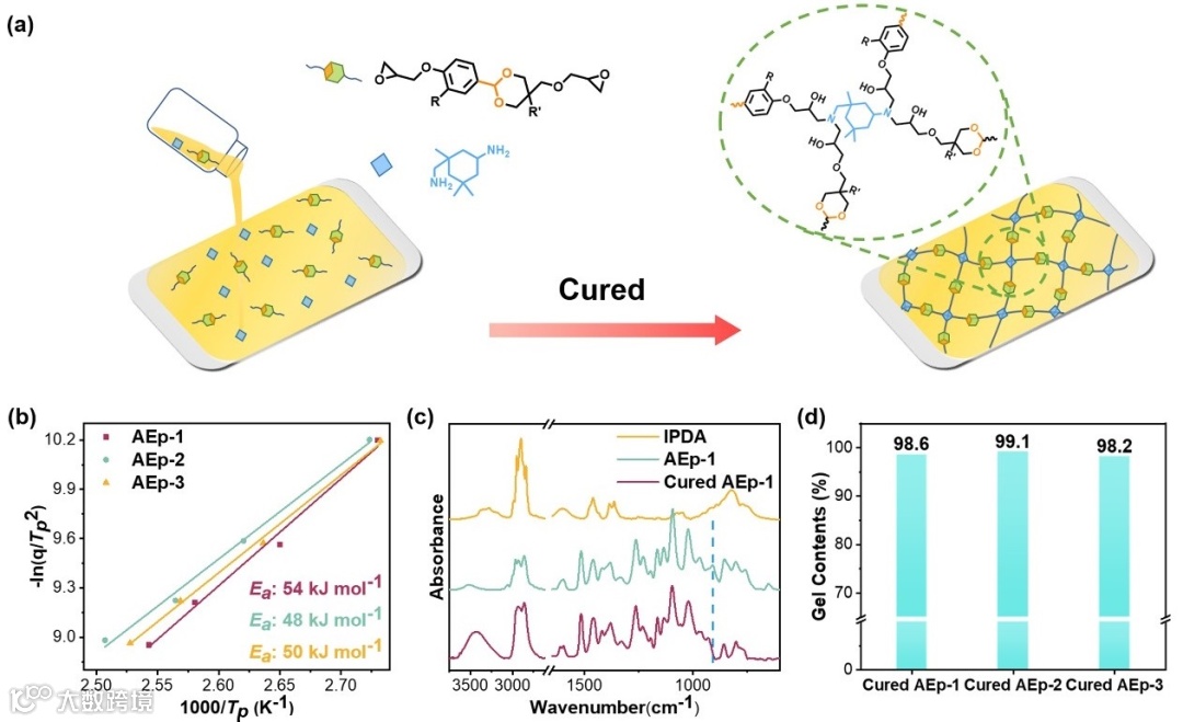 图6(a)环氧网络形成示意图;(b)基于Kissinger方法的线性拟合曲线;(c) IPDA、AEp-1和Cured AEp-1的红外光谱;(d)三种网络的凝胶含量