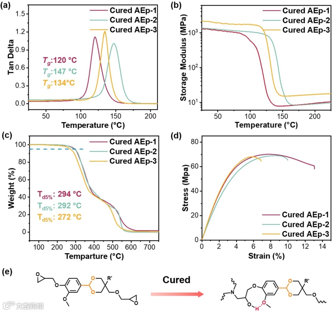 图7三种固化环氧树脂的热学性能和力学性能。(a)Tan δ和(b)储存模量随温度变化曲线;(c)TGA和(d)拉伸应力-应变曲线;(e)含-OCH3的环氧单体固化后形成分子内氢键示意图