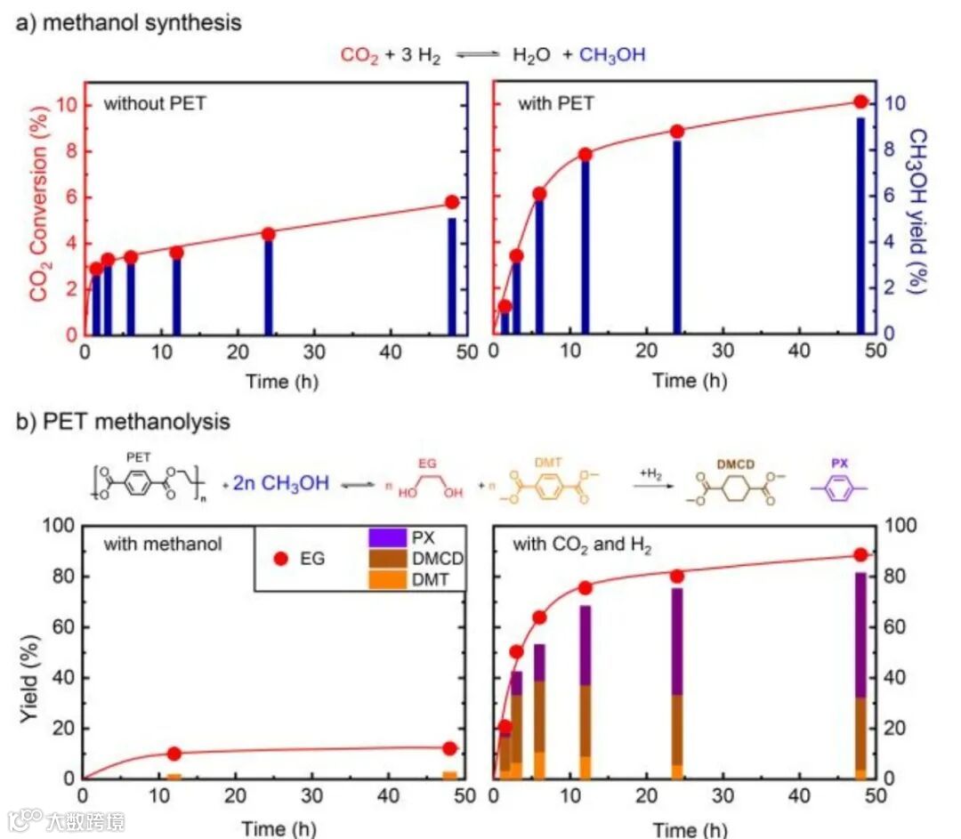 研究发现,CO2加氢和PET甲醇分解的协同耦合具有有趣的双重促进作用。PET的存在促进了CO2加氢反应,其产物甲醇被PET甲醇醇解原位消耗。CO2加氢在没有PET的存在下其甲醇产率只有5%,而加入PET后产率可以提升到9.4%。同时在加氢催化剂的存在下,由于产物(DMT)可以进一步加氢,促进了PET的甲醇醇解。直接加入甲醇PET的醇解的解聚程度(乙二醇EG产率)只有12.1%,而在有氢气的存在下,其EG产率攀升到88.6%。如此与单一反应相比,这种共转化的新策略显著提高了CO2加氢或PET甲醇分解的产率达2~7倍。