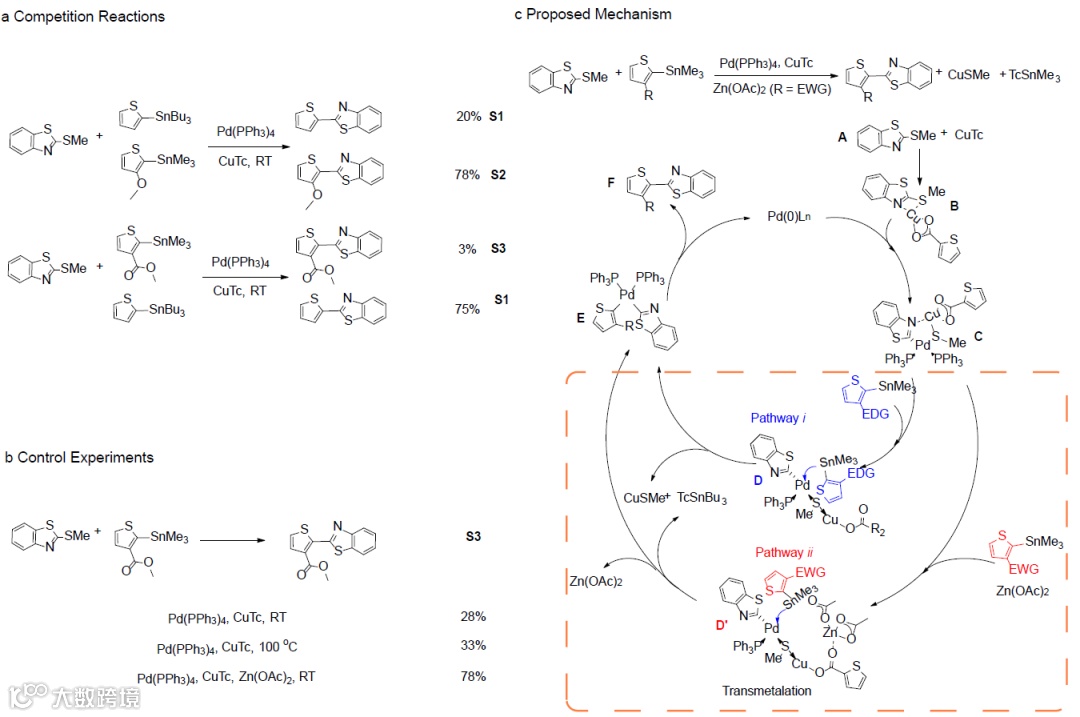 为了进一步理解碳-硫键反应过程中控制反应进行的关键因素,作者通过小分子竞争实验,以及对照试验研究,表明反应的决速步骤主要在于转金属反应历程,并且验证了给电子能力更强的亲核试剂反应速率快,产率高,最后提出了该方法的反应机理。
