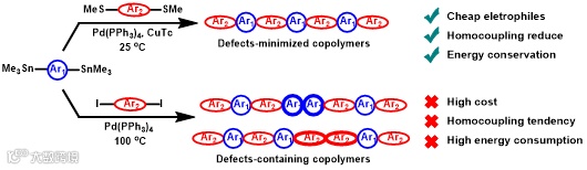 近期,黄辉/史钦钦团队与美国西北大学Tobin J. Marks教授等课题组合作开发了一种以芳基二硫醚为亲电试剂的室温Stille型交叉偶联聚合方法学。该方法比传统的热激活的Stille偶联反应具有更快的聚合速率和更少的自偶联缺陷,而且底物广泛,是制备聚合物半导体材料的新方法。
