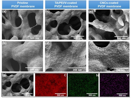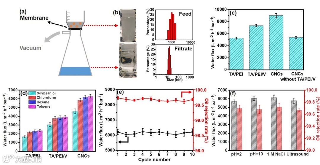 所开发的CNCs涂层可以沉积在聚偏二氟乙烯(PVDF)膜上并用于其油/水分离。TA/PEI/V涂层在膜表面表现为一层密集的聚集体。CNCs涂层可以在不牺牲膜的多孔结构的情况下沉积在膜表面(图4),赋予膜对于分离水包甲苯乳液优异的高渗透通量(超过6000 L m-2 h-1 bar–1) 和接近于100%的水通量恢复率(图5)。此外,CNCs修饰过后的PVDF膜在经过酸/碱/盐溶液或超声处理后,其对于水包甲苯乳液分离性未发生明显变化,表明CNCs修饰的膜材料即使在恶劣条件下也具有很好的稳定性。同时,CNCs涂层膜对表面活性剂和其他污染物如BSA均表现出优异的防污性能,这归因于紧密堆积的CNCs涂层在膜表面形成了稳定且致密的水合层。
