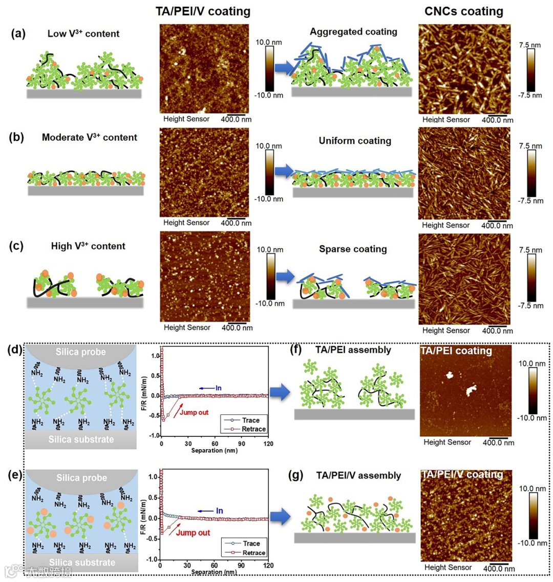受海洋生物粘附策略的启发,加拿大阿尔伯塔大学曾宏波教授团队与Xing-Zhen Chen教授等合作通过引入中间粘附层的方法,开发了一种简单高效的方法将分散的CNC固定为表面涂层的方法。所构建的CNC涂层包含双层结构:中间粘附层以及自组装CNC层。其中,中间粘附层由单宁酸(TA)/聚乙烯亚胺(PEI)/钒离子(V)组成,可在基底上引入大量官能团(例如氨基和邻苯二酚集团)用来锚定CNC。另外,TA/PEI/V中间粘附层的粗糙程度可通过调整V离子浓度控制,以此来调控所形成的CNC涂层的致密程度。