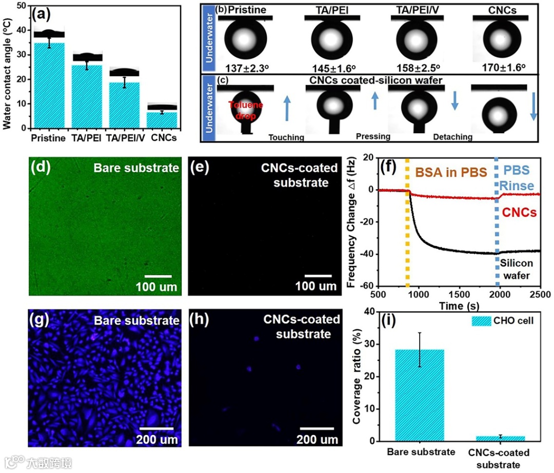 图三. TA/PEI/V-CNC的亲水性以及防污表征