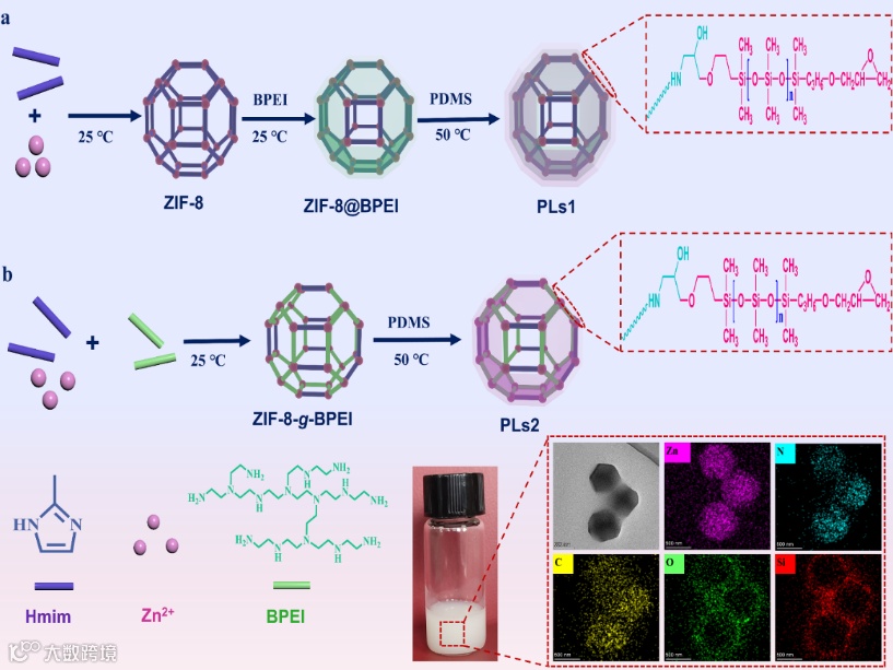 Scheme 1. Schematic representation on the synthesis of type Ⅰ PLs based on ZIF-8@BPEI (a) and ZIF-8-g-BPEI (b) via the covalent bonding strategy, respectively.