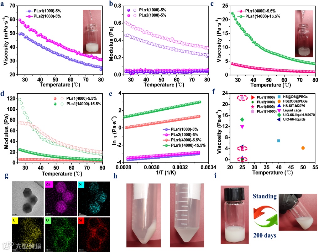 Figure. 1 The viscosity-temperature curves of PLs1(1000)-5%, PLs2(1000)-5%, and inset: squeezing PLs1(1000)-5% using a 5 mL syringe at 25 ℃ (a), and PLs1(4000)-5.5%, PLs1(14000)-15.5%, and inset: squeezing PLs1(14000)-15.5% using a 5 mL syringe at 25 ℃ (c), the modulus-temperature curves of PLs1(1000)-5%, PLs2(1000)-5% (b), and PLs1(4000)-5.5%, PLs1(14000)-15.5% (d), the fitting curve temperature dependence of viscosity given by Arrhenius equations (e), the plots of the viscosity versus temperature for type Ⅰ PLs from this work and previous literatures (f), TEM images, and corresponding EDS images of PLs1(1000)-5%, respectively (g), photographs of PLs1(1000)-5% (left), and PLs1(14000)-15.5% (right) centrifugation at 8000 rpm for 8 min at 25 ℃ (h), photographs of PLs1(1000)-5% standing for about 200 days at 25 ℃ (i).