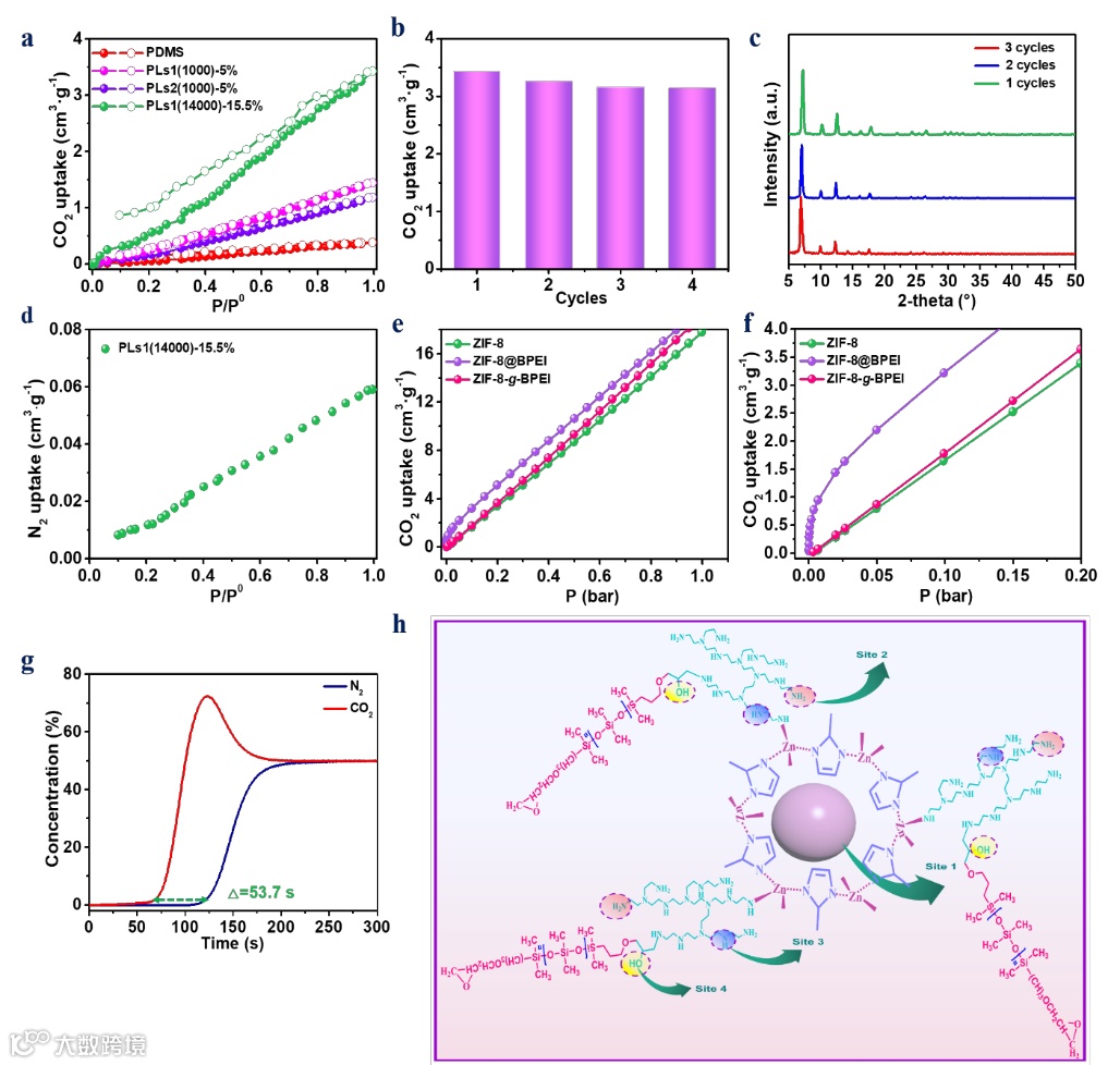 Figure. 2 CO2 adsorption (filled)-desorption (empty) isotherms of PDMS, PLs1, and PLs2 at 25 ℃, respectively (a), the cycles of CO2 adsorption capacity of PLs1(14000)-15.5 % under 1.0 P/P0 at 25 ℃, where PLs were regenerated by in situ vacuuming without heating (b), three cycles of PXRD patterns of PLs1(14000)-15.5 % (c), N2 adsorption isotherms of PLs1(14000)-15.5 % at 25 ℃ (d), CO2 adsorption isotherms of ZIF-8, ZIF-8@BPEI, and ZIF-8-g-BPEI (e, f), the breakthrough curves of PLs1(14000)-15.5 % for CO2/N2 (v/v, 50:50) mixtures at 25 ℃, 1.0 P/P0 (g), the proposed reaction mechanism of PLs1 and adsorption sites (h).
