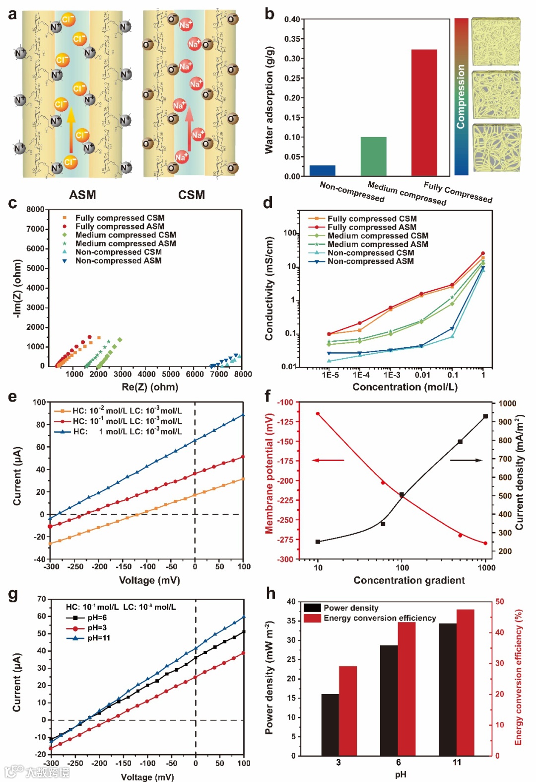 图5.(a)ASM(左)和CSM(右)中沿纳米通道的离子选择性传输示意图。(b)无压缩、中等压缩和完全压缩丝瓜络基ISMs的吸水性。(c)尺寸为3.8mm×3.8mm×0.3mm的压缩CSM和ASM的EIS曲线。(d)在不同浓度的NaCl电解质中的不同CSM和ASM的离子电导率曲线。(e)在高浓度(1,0.1,或0.01 M)和低浓度(0.001 M)NaCl溶液浓度梯度下的自制RED的电流-电压曲线。(f)丝瓜络基RED的膜电位和电流密度随NaCl溶液浓度梯度的变化。(g)丝瓜络基RED在不同pH下的电流-电压曲线以及(h)相应的能量转化效率和能量密度。
