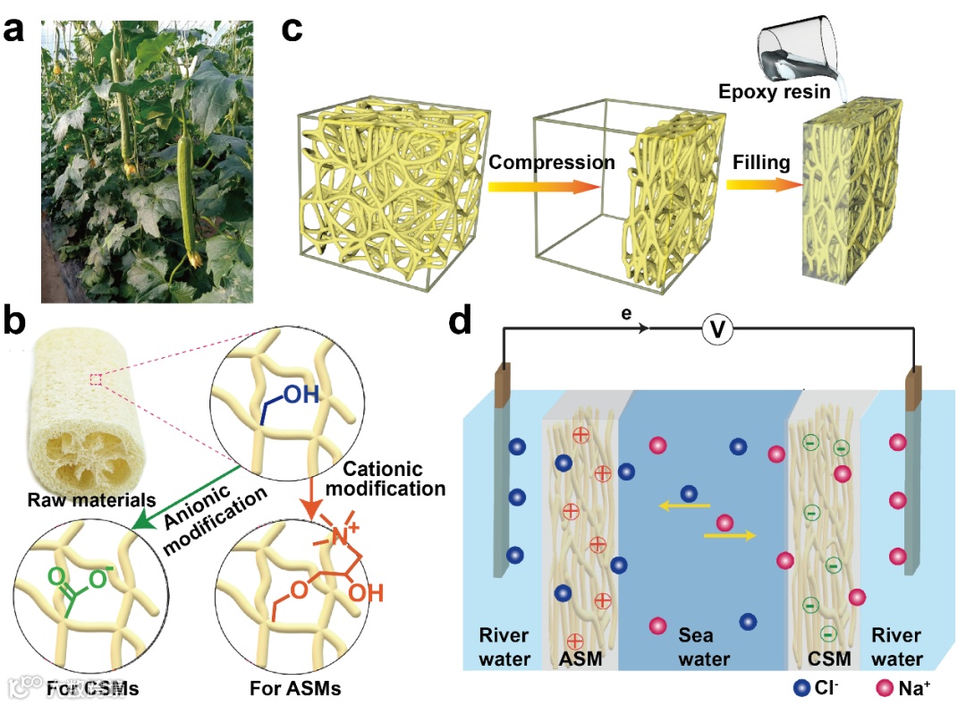 图1. 使用丝瓜络进行盐度梯度发电的示意图。(a)天然生长的丝瓜。(b)丝瓜络的离子改性用于阳离子离子选择膜(CSMs)和阴离子选择膜(ASMs)。(c)通过压缩和树脂填充用于制造丝瓜基离子交换膜(ISMs)。(d)丝瓜络基盐度梯度发电装置。
