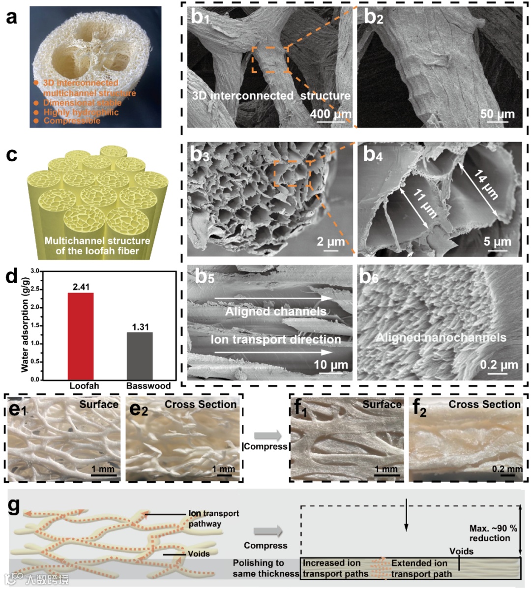 图2. 丝瓜络是一种很有前途的天然材料,用于制造低成本和高性能的ISMs。(a) 天然丝瓜络的照片。(b1-b6)丝瓜络三维互连结构,多孔道,及定向纳米孔道的SEM图像。(c) 丝瓜纤维多通道结构示意图。(d)丝瓜络和椴木吸水性的比较。天然丝瓜络表面(e1)和横截面(e2)的光学显微镜照片,具有高孔隙体积和低纤维密度。表面截面(f1)和横截面(f2)的压缩丝瓜络的光学显微镜照片,孔隙体积减小,纤维密度增加。(g)丝瓜络压缩前后离子传输行为示意图。