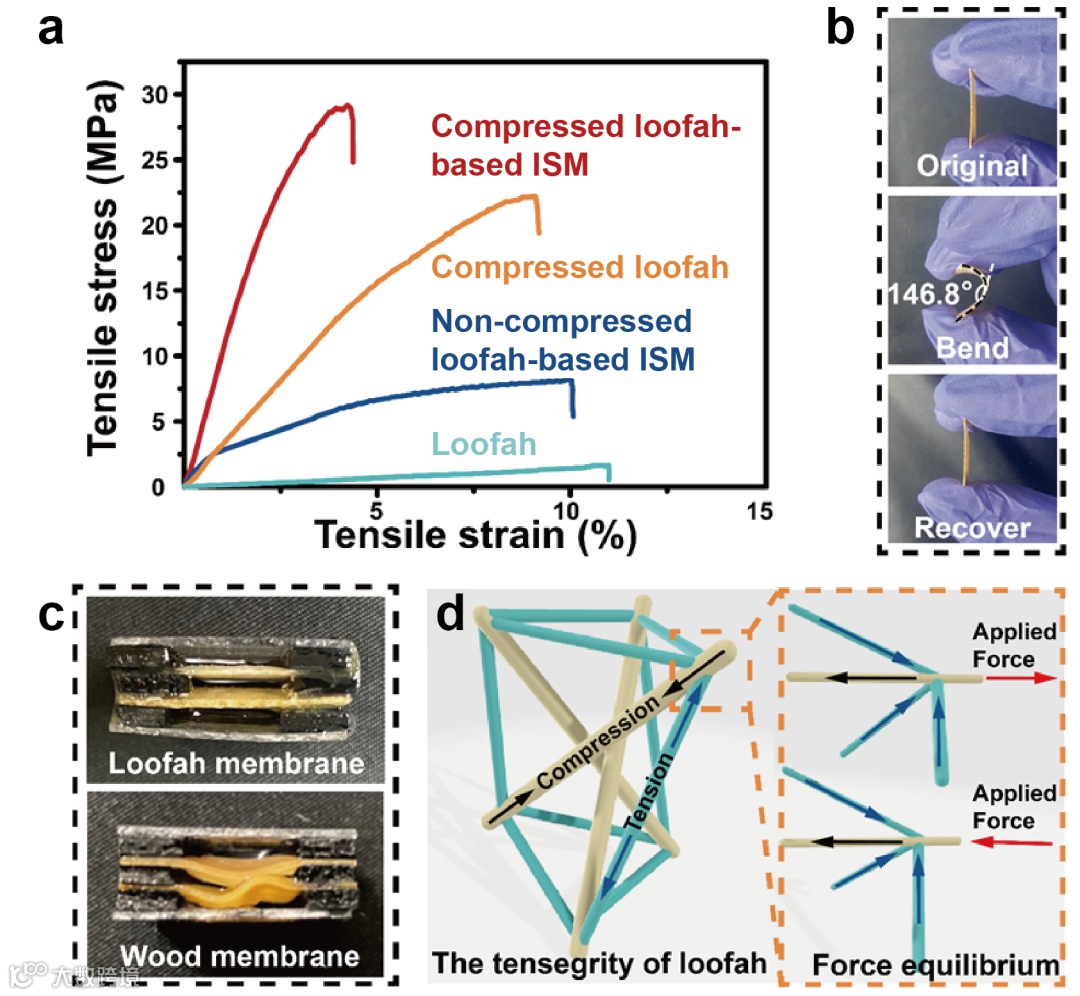 图7. 丝瓜络基ISMs的机械性能和尺寸稳定性表征:(a)压缩丝瓜络基ISMs、压缩丝瓜、非压缩丝瓜络基ISMs和非压缩丝瓜络的抗拉强度。(b)压缩丝瓜络基于ISM的可弯曲性照片。(c)压缩丝瓜络基ISM(顶部)和木头膜(底部)的尺寸稳定性照片。(d)丝瓜络天然张紧结构的示意图。