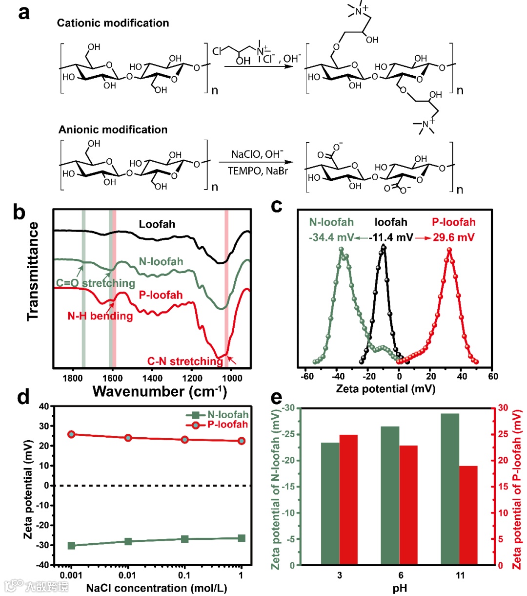 图3.丝瓜络的化学改性和表征。(a)通过阳离子改性的醚化反应得到的阳离子丝瓜络(P-loofah)和通过阴离子改性的TEMPO介导氧化得到的阴离子丝瓜络(N-loofah)。(b)丝瓜络、P-loofah和N-loofah的FTIR光谱。(c)丝瓜络、P-loofah和N-loofah稀释到0.1mg ml-1时的zeta电位。(d)丝瓜络、P-loofah和N-loofah在不同氯化钠溶液浓度时(0.001~0.1 M)的Zeta电位。(e)丝瓜络、P-loofah和N-loofah在0.1 M NaCl溶液时不同pH值(3~11)下的Zeta电位。