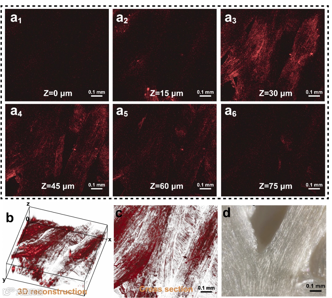 图4.(a)丝瓜络基的ASM在不同深度下(0~75μm)的激光共聚焦显微镜图像。(b)基于激光共聚焦显微镜图像的ASM的三维重建。(c)环氧树脂包埋中的丝瓜的横截面图像。(d) 无树脂填充的压缩过丝瓜膜的光学显微镜照片。