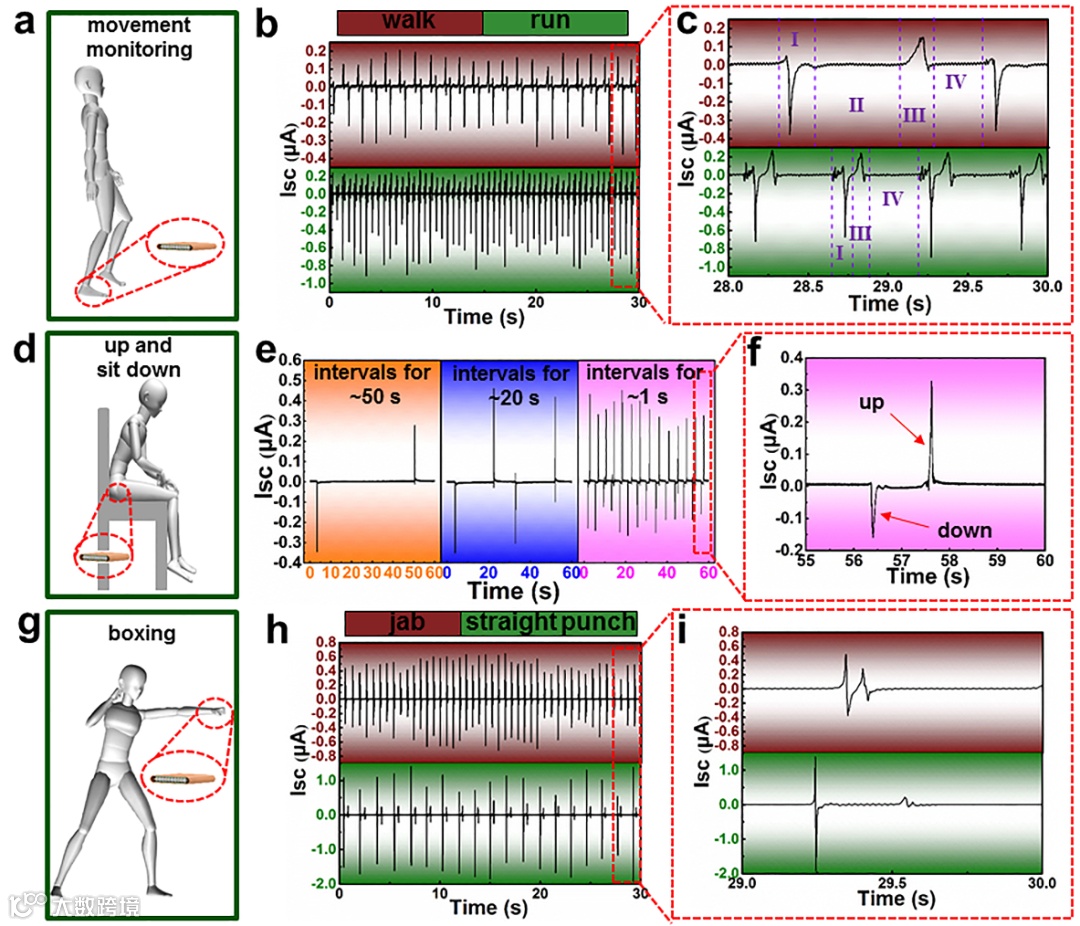 图4 a-c)安装在鞋底的柔性DS-TENG实时监测人的步态、步频;d-f)将DS-TENG放置在椅子上,监测人的坐姿行为;g-i)在沙袋上安装DS-TENG,检测拳手的冲力、冲量、冲击时间。