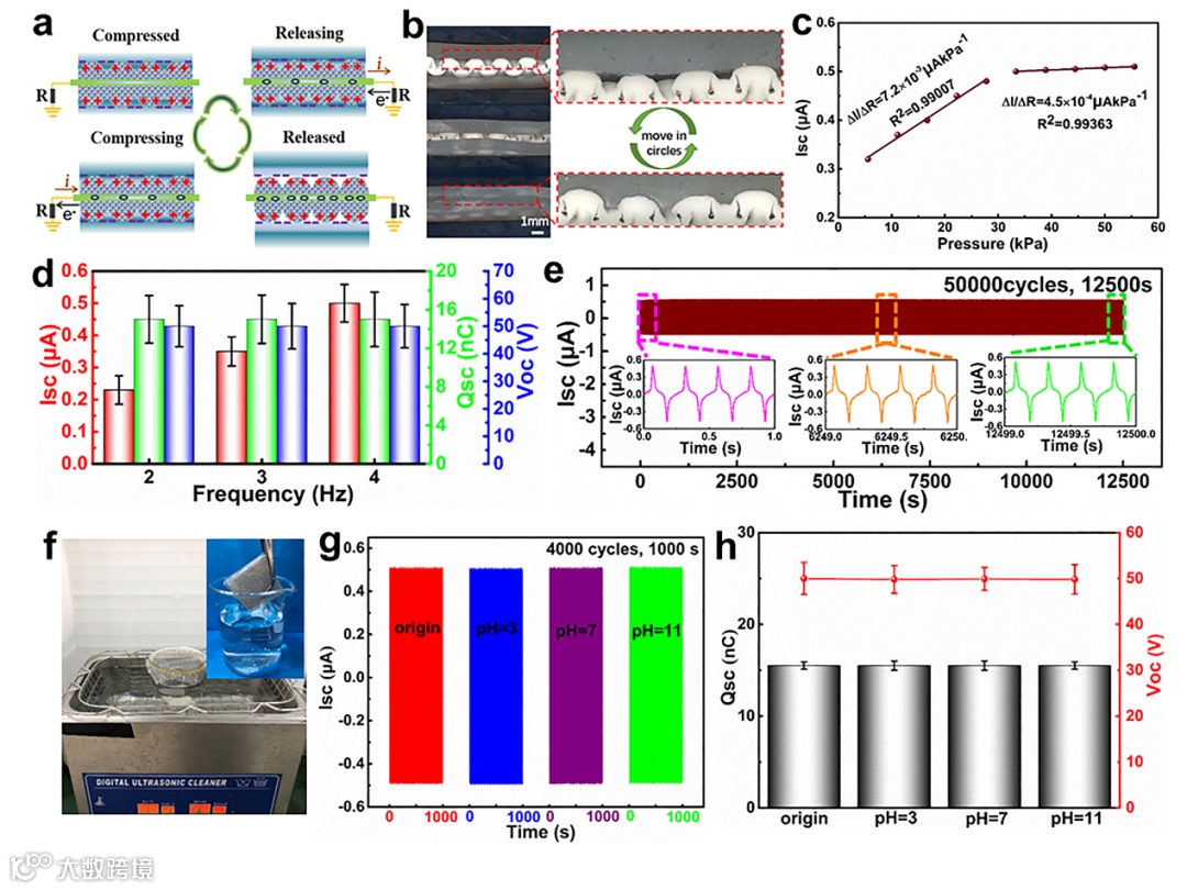 图3 a) DS-TENG的工作原理示意图;b) DS-TENG受压和释放过程的照片;c)不同压力下DS-TENG的Isc结果拟合曲线;d)频率为2、3和4 Hz的DS-TENG的Isc、Voc和Qsc统计结果;e) DS-TENG在12500 s内进行50000次循环的输出结果;f) DS-TENG在酸性和碱性溶液中超声浸泡的照片;g)酸碱处理后的Isc测试结果和h) Voc和Qsc统计结果