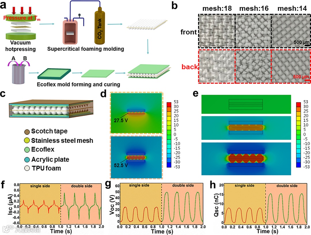 图1 a) DS-TENG的制备工艺b)不同目数不锈钢网电极制备的TPU泡沫前后视图照片c) DS-TENG组件示意图d)单面和双面TENG电位分布仿真结果e) DS- TENG从完全压缩状态恢复到释放状态时摩擦电势变化的仿真结果f) Isc, g) Voc, h) Qsc单面和双面TENG输出对比。