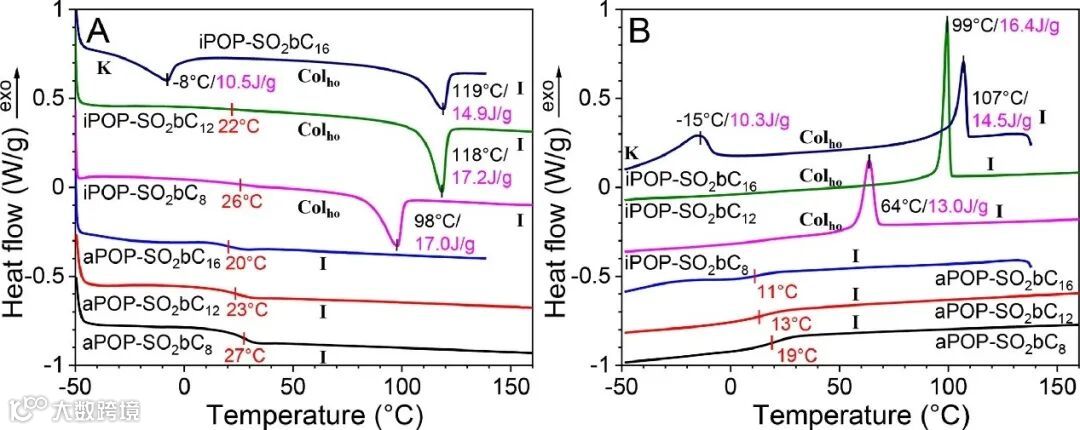 当碳链长度增长后,从DSC加热和冷却曲线(图3 A、B)中可以观察到所有等规聚合物都具有可逆相变,而无规聚合物在主要为无定形态。iPOP-SO2bC16的长侧链尾部在 -15 oC结晶成劣质晶体,-8 oC熔融,作者推测该碳链参与结晶的部分大约为5-8个尾部碳原子而非整个碳链。