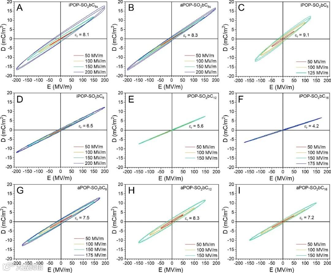 图5所示结果为各样品热压薄膜在室温下的D-E环。当施加极化电场达到200 MV/m时,无论是无定形态还是液晶态都测得线性D-E环,没有观察到典型铁电转换。作者认为磺酰基与主链的共价连接以及较强的偶极相互作用阻止了偶极翻转的发生。不过,由于强偶极磺酰基的振动,这些聚合物展现出较高的表观介电常数 (εr)。室温无定形聚合物的磺酰基通过极化电场能够实现了较大振动,具有较高的εr(εr = 7.2-9.1);而液晶态聚合物的εr较低,主要是因为有序的液晶结构增强了邻近磺酰基之间的偶极相互作用,抑制了偶极振动的过程。
