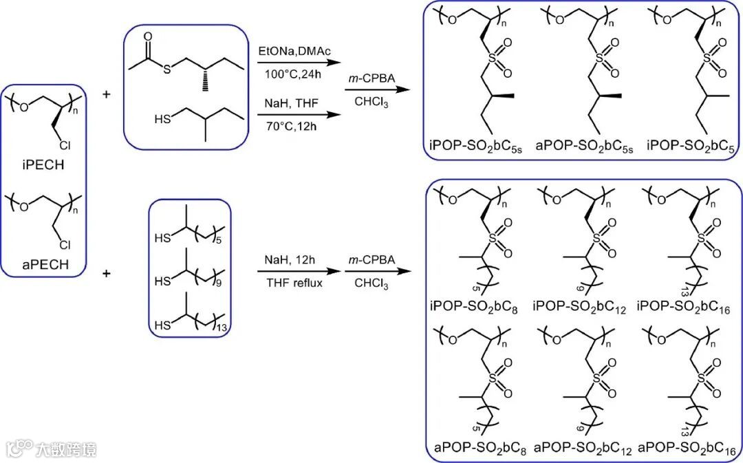 合成了基于手性iPECH和外消旋aPECH的两个系列磺化侧链聚醚,包括:①含有手性或外消旋甲基支化的C5侧链;②含有外消旋甲基支化及更长的侧链。获得的聚醚材料都包含甲基支化,但是手性有四种不同情况:主链手性+侧链手性;主链手性+侧链外消旋;主链外消旋+侧链手性;主链外消旋+侧链外消旋。