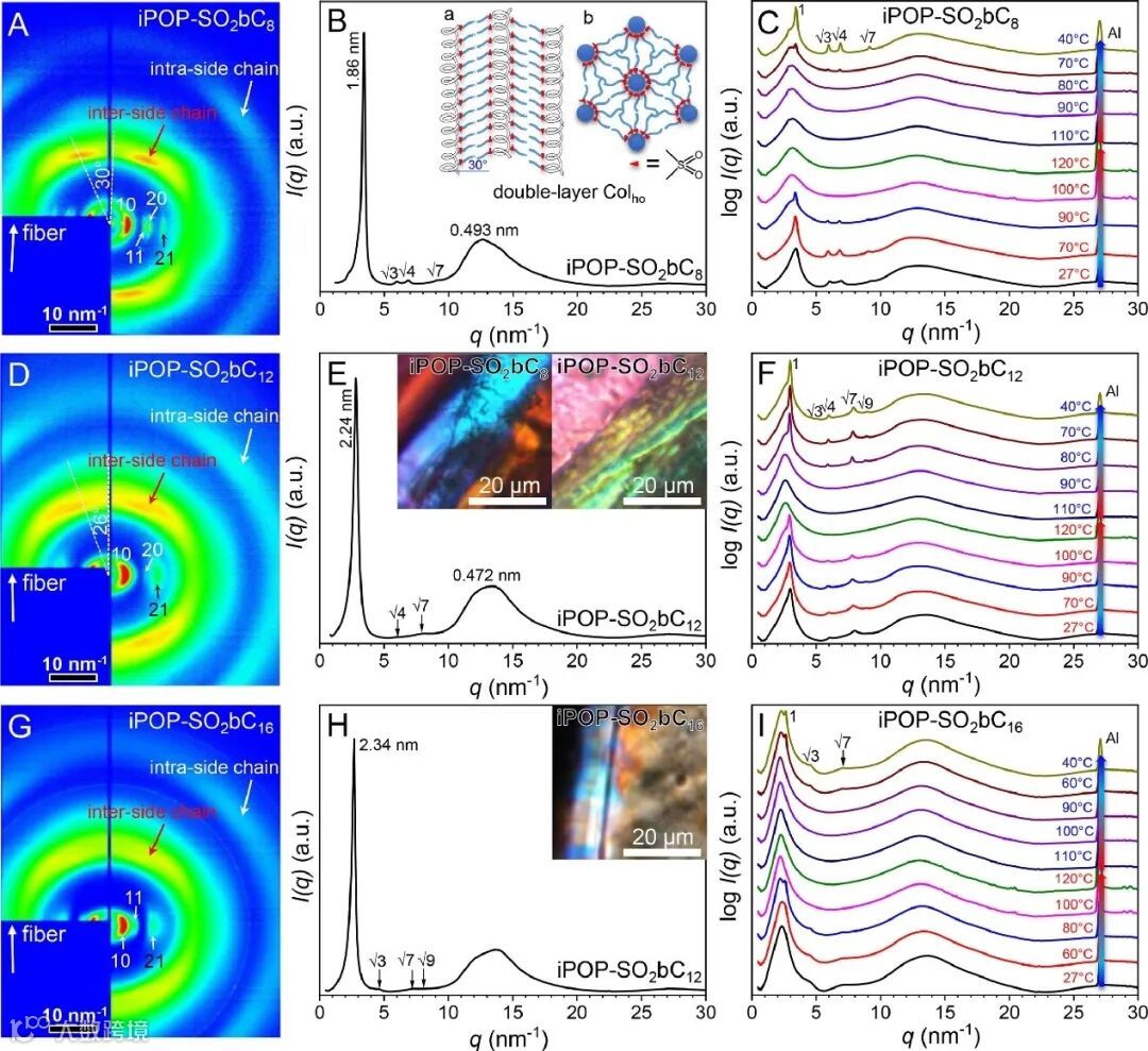 图4. 室温下2D(A、D、G)和1D(B、E、H)XRD结果,(C、F、I)相应的加热和冷却XRD曲线。(A-C)iPOP-SO2bC8, (D-F) iPOP-SO2bC12和(G-I) iPOP-SO2bC16。