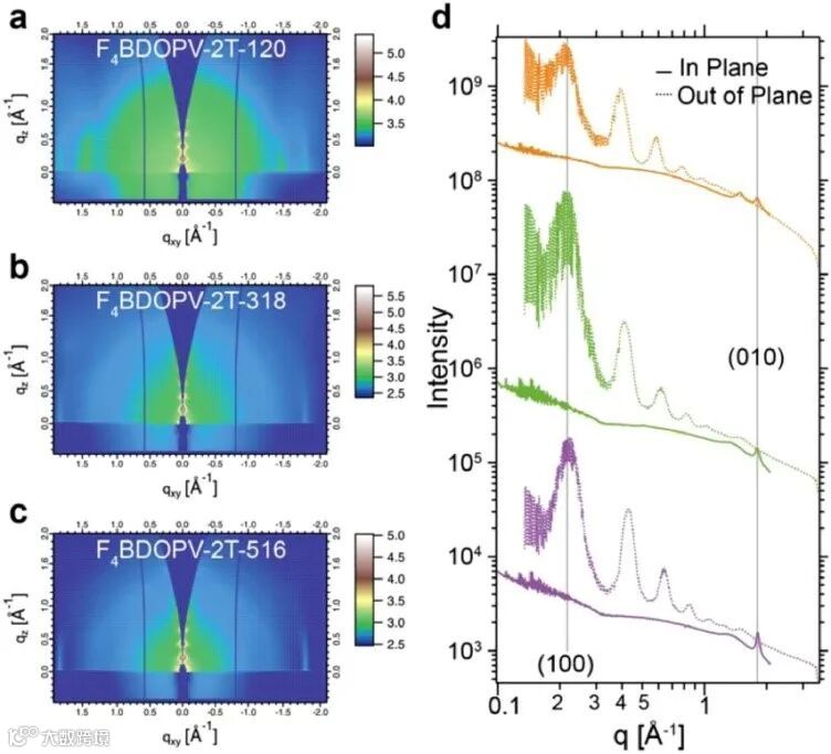 图4. 薄膜微观结构。(a,b,c)2D-掠入射X射线散射。(d)21D-掠入射X射线散射。