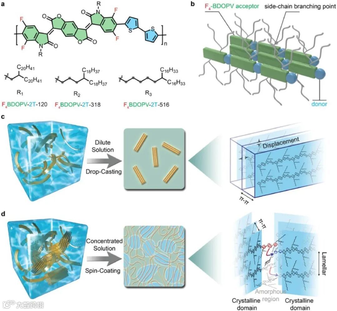 图1. 溶液聚集态通过侧链工程对共轭高分子结晶过程的影响。(a)相同长度,不同分叉位点的烷基侧链取代的F4BDOPV-2T系列高分子的化学结构。(b)F4BDOPV-2T的堆积模式。溶液聚集态对共轭高分子结晶行为的影响(c)稀溶液中形成的微米线和(d)浓溶液中形成的薄膜。