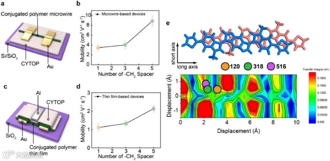 图5. 微米线晶体和薄膜中的电荷传输。(a)底栅顶接触薄膜晶体管器件。(b)基于微米线的器件迁移率与-CH2间隔基团的关系。(c)顶栅底接触薄膜晶体管器件。(d)基于薄膜的器件迁移率对与-CH2间隔基团的关系。(e)电子转移积分与高分子链间位错的关系。