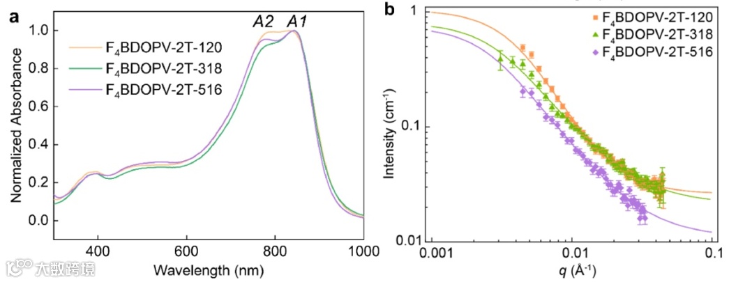 图2. F4BDOPV-2T高分子的溶液聚集态。(a)吸收光谱。(b)小角中子散射曲线。