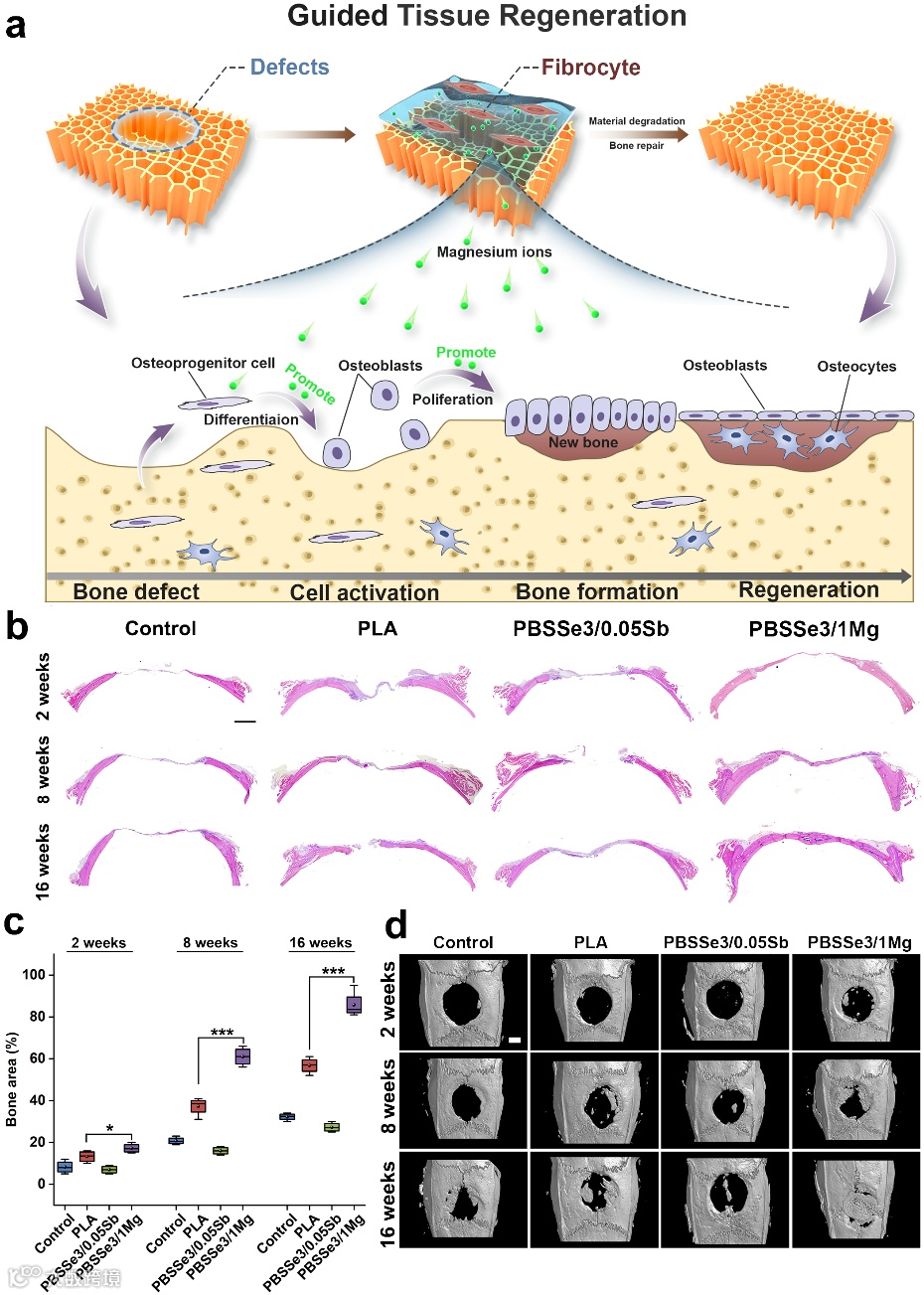 最后该工作建立了小鼠颅骨缺陷模型,并使用PLA膜进行了对比评估,这是因为PLA膜在GTR领域已得到商业应用,从而探究PBSSe3/1Mg膜在GTR领域的可行性 (图4)。动物实验结果表明对照组和PBSSe3/0.05Sb组在16周后几乎没有新骨产生,而PLA组有更多的新生骨,但骨的再生程度低于PBSSe3/1Mg组,这与PBSSe3/1Mg组膜中镁离子的成骨活性以及抗炎活性有关。动物实验进一步表明原位合成的聚酯具有很高的成骨活性且16周后的骨再生程度显著高于PLA膜。