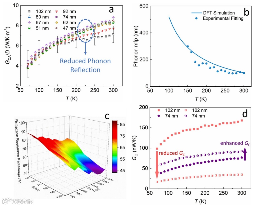 图2.(a)氮化硼纳米管直接接触时的单位面积界面热导特性(b)层状氮化硼法向声子自由程(c)声子反射作用对界面热阻的贡献(d)PVP中间层对界面热导的双向调节作用