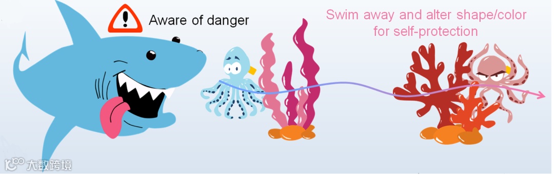 图1丨章鱼遇险时通过喷水迅速向反方向移动逃跑,同时改变它们的形状和皮肤颜色,以便于融入周围环境