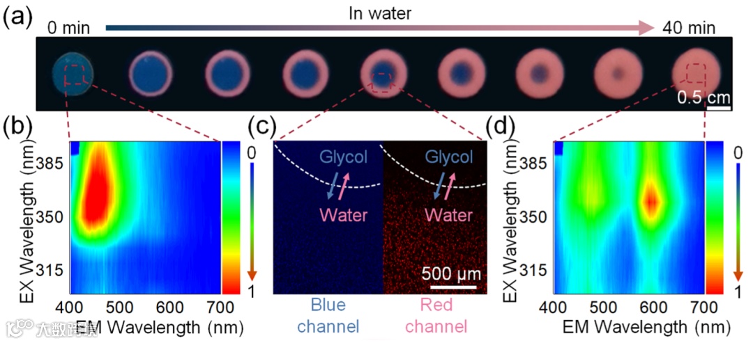 图5丨基于聚集诱导发光的聚丙烯酰胺/丙烯酸/碳点凝胶及其驱动器的仿生章鱼在溶剂交互刺激下的协同变形变色运动行为