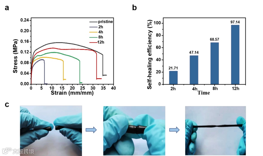 在具备优异机械性能同时,材料保持良好的自修复能力。室温下修复24小时即可达到97.14%的修复效率。