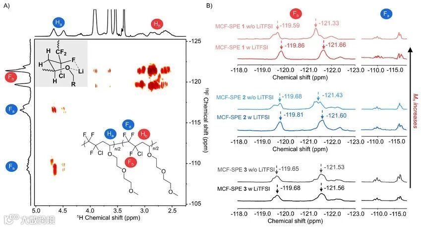 图2.含氟聚合物弱溶剂化研究A)含氟聚合物二维核磁谱图B) 掺锂盐前后氟谱位移变化