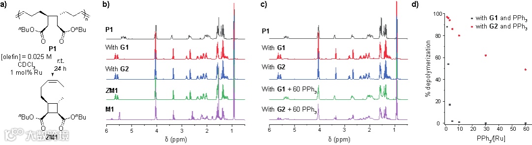 图5. 聚合物的解聚实验。(a)解聚反应式;(b)黑色为聚合物解聚前的核磁氢谱;红色和蓝色分别为常温下使用Grubbs I和Grubbs II解聚24小时后的核磁氢谱;作为参考,绿色和紫色分别为顺式及反式单体;(c)黑色为聚合物解聚前的核磁氢谱;红色和蓝色分别为常温下使用Grubbs I和Grubbs II解聚24小时后的核磁氢谱;绿色和紫色分别为常温下使用Grubbs I和Grubbs II并加入60当量三苯基膦尝试解聚24小时后的核磁氢谱。(d)使用不同当量的三苯基膦时的解聚率变化。