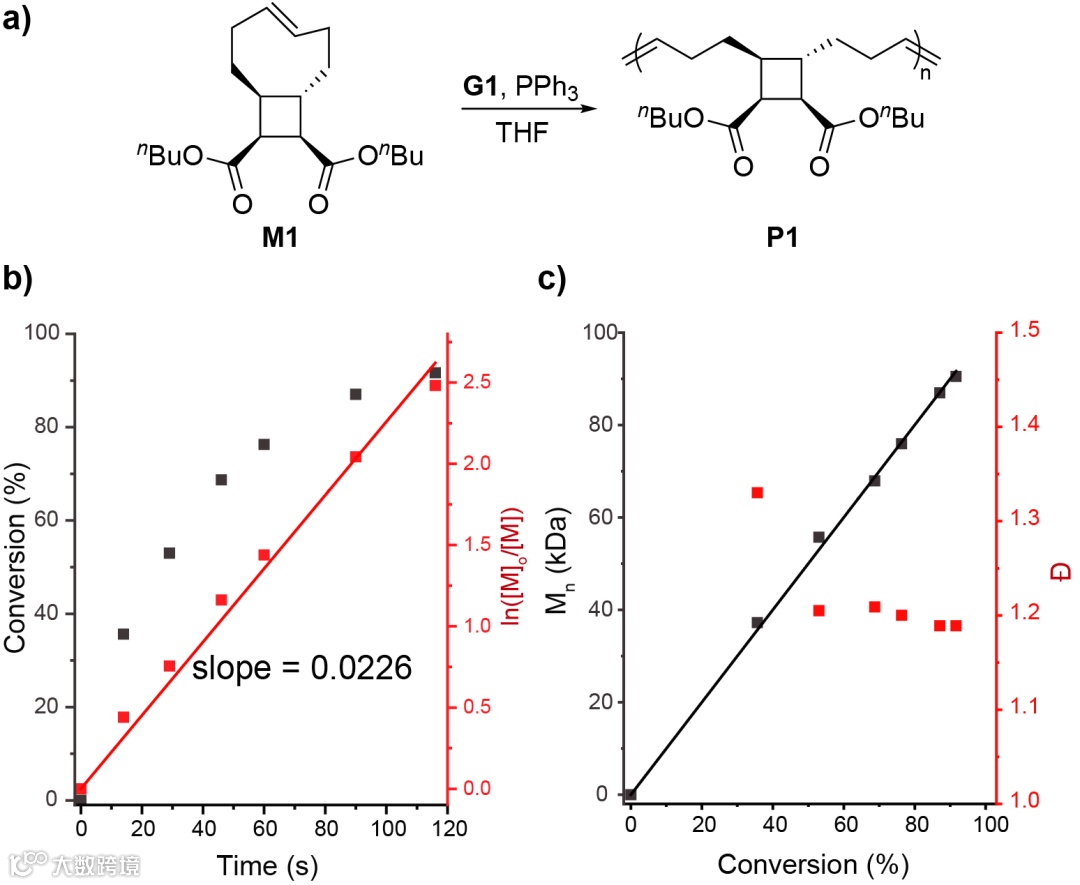 图3. 聚合反应的动力学研究。(a)聚合反应的反应式;(b)转化率(黑色)以及ln[(M]o/[M])(红色)根据时间的变化;(c)数均分子量(黑色)以及分散度(红色)在不同转化率下的变化。