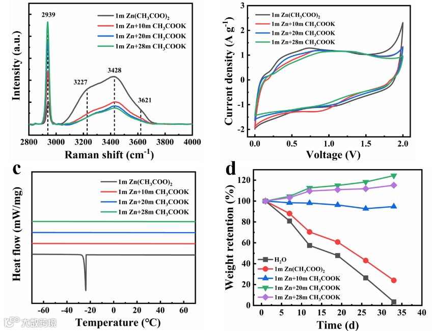 中国科学技术大学闫立峰教授课题组将N,P双掺杂的石墨烯水凝胶正极与锌负极和聚丙烯酸钾/羧甲基纤维素钠双网络水凝胶(PAAK/CMC)包裹的乙酸基“盐包水”电解质相结合,组装了高性能的柔性锌离子混合电容器。拉曼分析表明,相对于稀的1M Zn(CH3COO)2,引入具有高溶解度的CH3COOK来“锁住”自由的水分子,高浓度混合乙酸基电解质中的自由水的活性得到有效抑制,进而拓宽了电压窗口。考虑到高浓度电解质带来的粘度增大及导电率降低问题,通过在氧化还原石墨烯中掺杂N,P原子来提高电极比电容和电子转移能力,同时提高了锌离子混合电容器的循环倍率性能。结合前期的工作,在紫外光引发下,利用PAAK/CMC原位包裹1 M Zn(CH3COO)2和20 M CH3COOK,将ZHSCs的电压窗口扩大到0~2.1 V,能量密度高达106.5 Wh kg-1。尽管没有添加其它有机溶剂,归功于“消失”的自由水分子,电解质的工作温度范围被拓宽至-15℃-65℃。由于双网络凝胶的高强度力学性能,组装的柔性锌离子混合电容器即使在弯曲(180°)和挤压条件下,该器件也能在不牺牲电容的情况下工作,展现出了极具潜力的柔性器件应用。该柔性锌离子混合电容器从工作电压窗口,能量密度,倍率性能以及工作温度范围等多方面得到了提升,在柔性电子产品应用中极具优势。