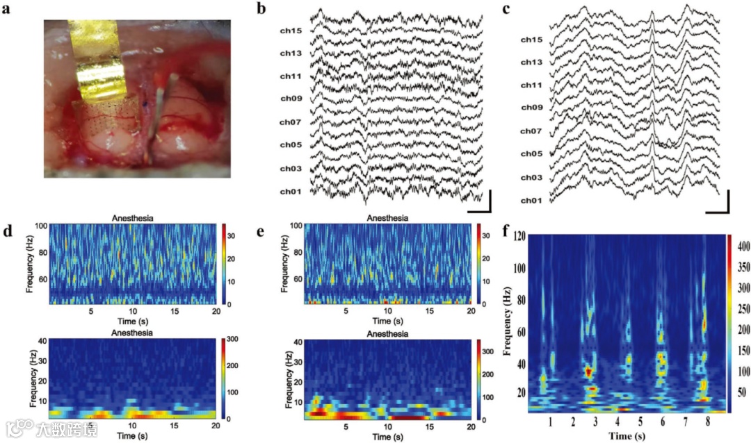 图3.利用Au/PIN-5NO2/PEDOT微电极体内记录小鼠大脑皮层电信号(ECoG)。a)64通道Au/PIN-5NO2/PEDOT修饰ECoG器件放置在小鼠大脑表面的图片。b)急性植入64通道Au/PIN-5NO2/PEDOT修饰ECoG(微电极面积为706.5 μm2)器件捕获的ECoG原始信号。c)与(b)相同,但使用的是商业ECoG微电极,其面积为1962.5μm2。d) Au/PIN-5NO2/捕获的ECoG低频(下)和高频(上)频谱图。e)与(d)相同,但使用的是商业ECoG微电极。f) Au/PIN-5NO2/PEDOT微电极在拂动胡须过程中捕获ECoG信号的相应频谱图。