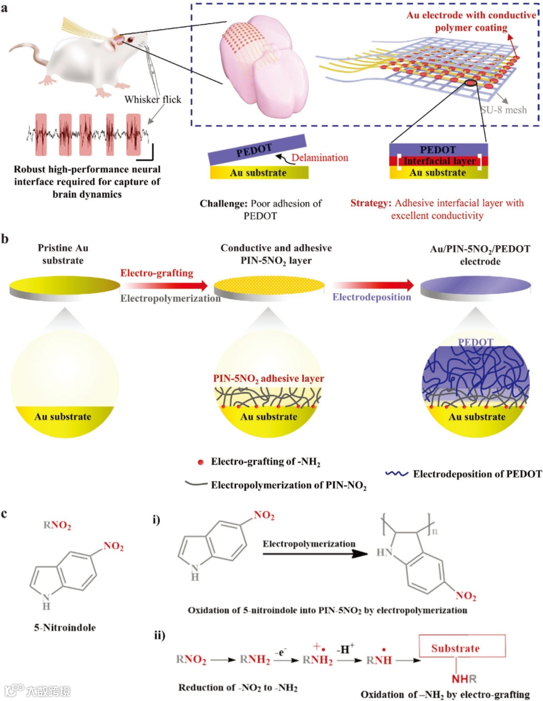 华中科技大学罗志强教授、中科院深圳先进技术研究院李骁健教授等人利用聚吲哚衍生物的优点,开发了一种具有优异导电性能的聚(5-硝基吲哚)(PIN-5NO2)作为粘附界面层,以增强PEDOT与金属电极的粘附。一方面5-硝基吲哚可通过电聚合制备具有优良电性能的共轭PIN-5NO2。另一方面聚合过程中5-硝基吲哚中的硝基还原而成的氨基可通过电接枝,与金(Au)电极基底形成强的附着力。以PIN-5NO2作为导电粘附界面层,Au/PIN-5NO2/PEDOT电极表现出优异的电化学性能及机械性能稳定性。Au/PIN-5NO2/PEDOT修饰ECoG器件的体内评估显示了捕获大脑神经动力学的卓越能力。该策略为构建稳固的高性能神经界面提供了新思路。该研究以题为 “Poly(5-nitroindole) Thin Film as Conductive and Adhesive Interfacial Layer for Robust Neural Interface”的论文发表在《Advanced Functional Materials》上。